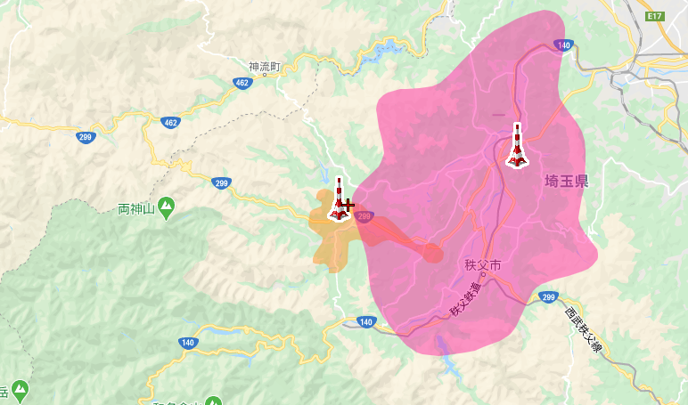 この画像はオレンジの範囲が小鹿野中継局の電波が届いているエリアピンクの範囲が秩父中継局の電波が届いているエリアというのを表しています。