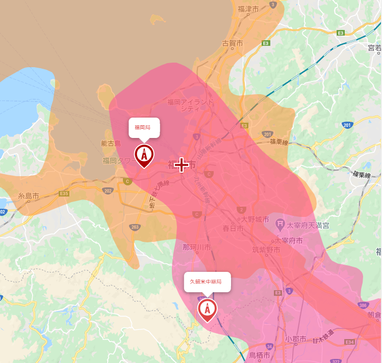 この画像はオレンジの範囲が福岡タワーの電波が届いているエリアピンクの範囲が久留米中継局の電波が届いているエリア、というのを表しています。