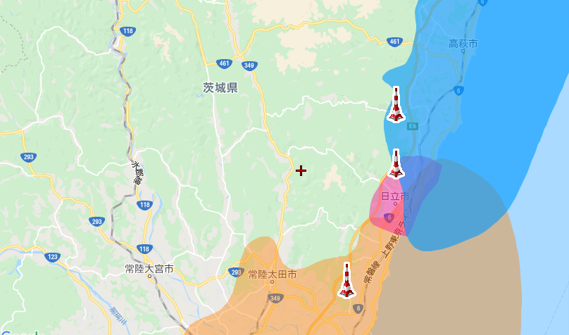 この画像はオレンジの範囲が日立中継局の電波が届いているエリアピンクの範囲が日立神峰中継局の電波が届いているエリアブルーの範囲が十王中継局の範囲が届いているエリアというのを表しています。
