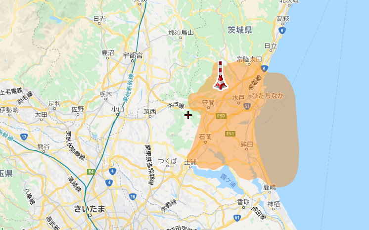 この画像はオレンジの範囲が水戸中継局の電波が届いているエリア、というのを表しています。