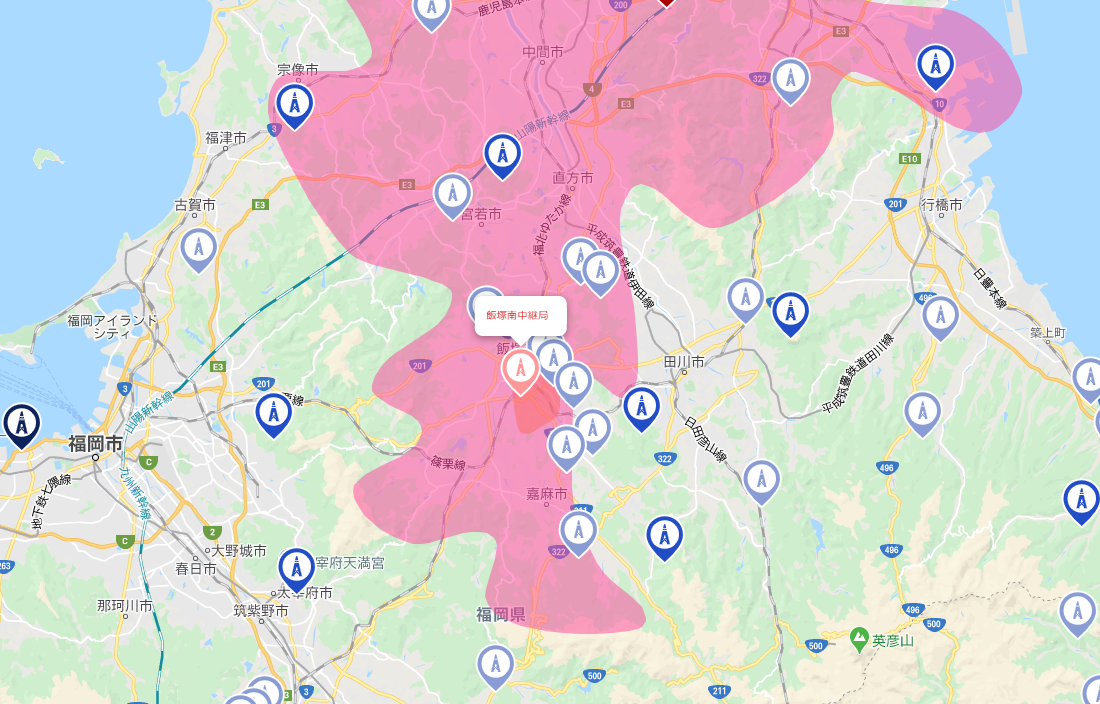 この画像はオレンジの範囲が飯塚南中継局の電波が届いているエリア、ピンクの範囲が北九州局の電波が届いているエリア、というのを表しています。