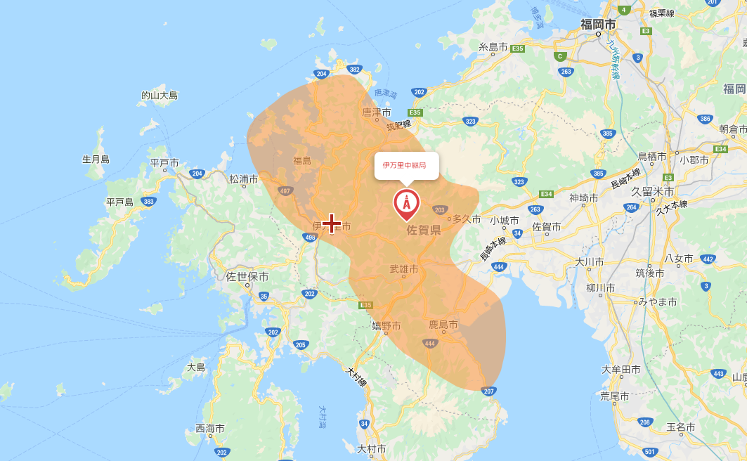 この画像はオレンジの範囲が伊万里中継局の電波が届いているエリア、というのを表しています。