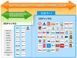 ただし、視聴する為にはスカパー・WOWOWと別途契約(有料)が必要で、契約内容によって視聴できるチャンネル・料金は異なります。無料で視聴できるのは、NHK BS1 NHK BSプレミアム、BS日テレ、BS朝日、BS-TBS、BSテレ東、BSフジ、BS11、BS12、放送大学2chの計11ch+CSの無料放送分です。