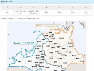 北九州市内でアンテナを建てて地デジを見る場合に見られるチャンネルは7ch。上記画像は、電波の送信塔による配信番組の違いで、北九州黒川や谷町の電波塔からしか電波を取れないというケースでは、NHKしか映らない、という事を示しています。