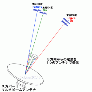 スカパーは上記の110・124・128度の3つの衛星のすべてでチャンネルがあり、一般的なBS/CSアンテナで視聴できるのは110度の「スカパーチャンネル」で、124・128度は「スカパープレミアム」の為、対応しているアンテナが必要です。