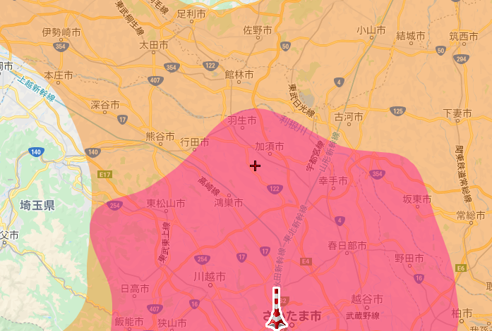 この画像はオレンジの範囲が東京スカイツリーの電波が届いているエリア、ピンクの範囲が浦和局の電波が届いているエリアというのを表しています。