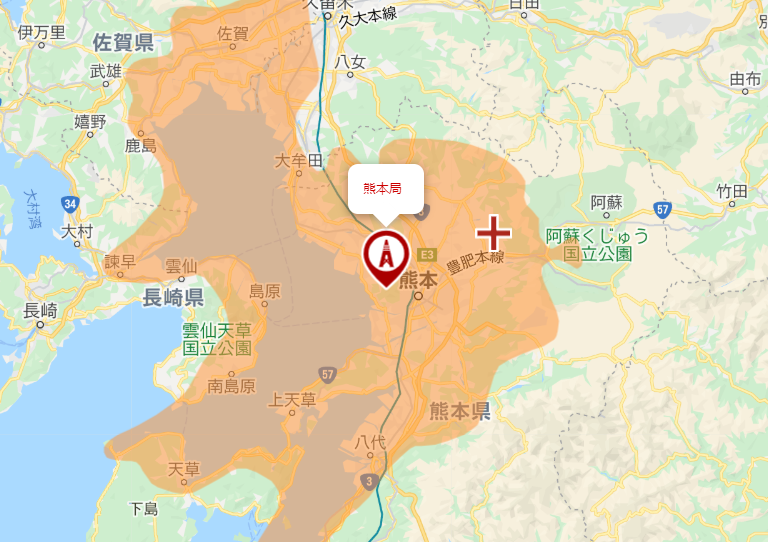 この画像はオレンジの範囲が熊本局の電波が届いているエリア、というのを表しています。