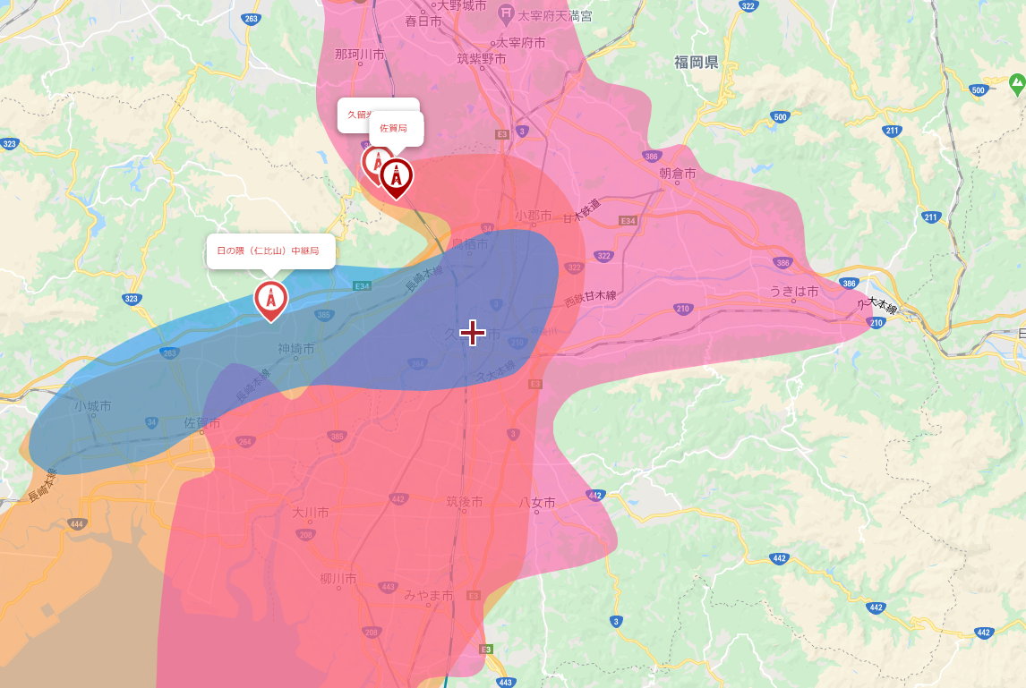 この画像はオレンジの範囲が佐賀局の電波が届いているエリア、ピンクの範囲が久留米中継局の電波が届いているエリア、というのを表しています。
