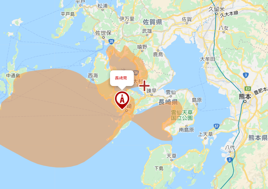 この画像はオレンジの範囲が長崎局の電波が届いているエリア、というのを表しています。