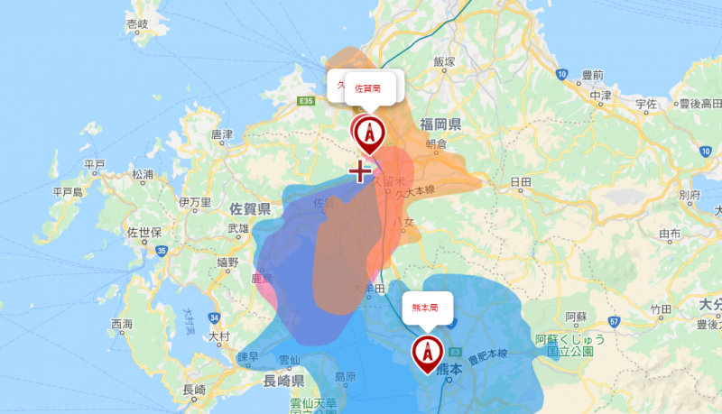 この画像はオレンジの範囲が久留米中継局の電波が届いているエリア、ピンクの範囲が佐賀局の電波が届いているエリア、ブルーの範囲が熊本局の電波が届いているエリア、というのを表しています。