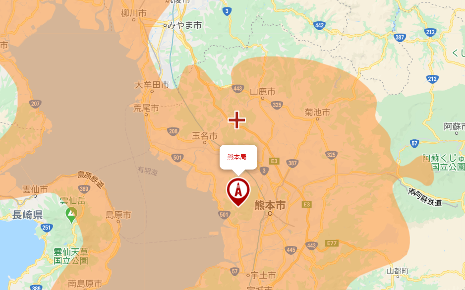 この画像はオレンジの範囲が熊本局の電波が届いているエリア、というのを表しています。