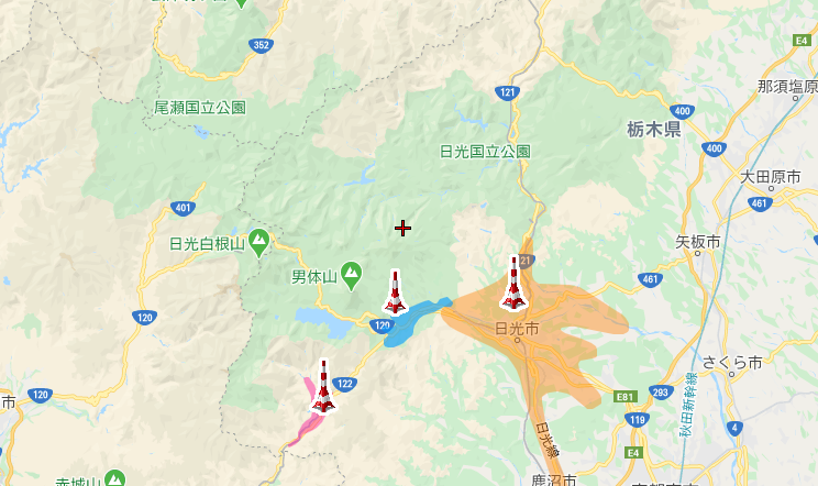 ごちゃごちゃした表示になるため上記画像では日光市の電波塔の一部しか表示していませんが日光市には他にも電波塔があり、日光市で人が住んでいるほとんどのエリアはテレビアンテナで問題なく地デジ放送を視聴することが出来ます。