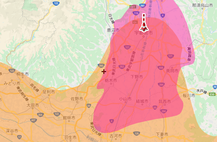 この画像はオレンジの範囲が東京スカイツリーの電波が届いているエリアピンクの範囲が宇都宮局の電波が届いているエリア、というのを表しています。このように小山市は全域に地デジの電波が届いており、基本的には地デジアンテナを設置して地デジを視聴することができます。